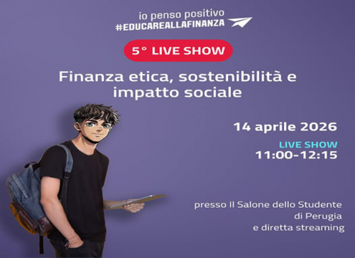 Martedì 14 aprile al Salone dello Studente di Perugia va in scena il quinto Live Show della VIII edizione del progetto IoPensoPositivo – Educare alla Finanza finanziato dal ministero delle Imprese e del Made in Italy, realizzato da Unioncamere con la collaborazione del Comitato per l'educazione finanziaria e delle Camere di commercio. “Finanza etica, sostenibilità e impatto sociale” è il titolo dell’incontro, dedicato a un tema sempre più centrale nel dibattito economico contemporaneo: la finanza etica e sostenibile. Un’occasione per approfondire come le scelte economiche individuali possano generare impatti concreti sull’ambiente, sulla società e sulle opportunità future.